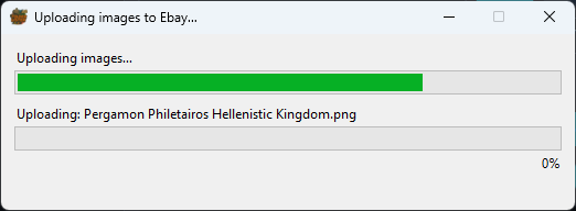 When everything is set, press Go!. Folder Lister uploads your images to eBay (EPS). A progress dialog shows which image is being uploaded.