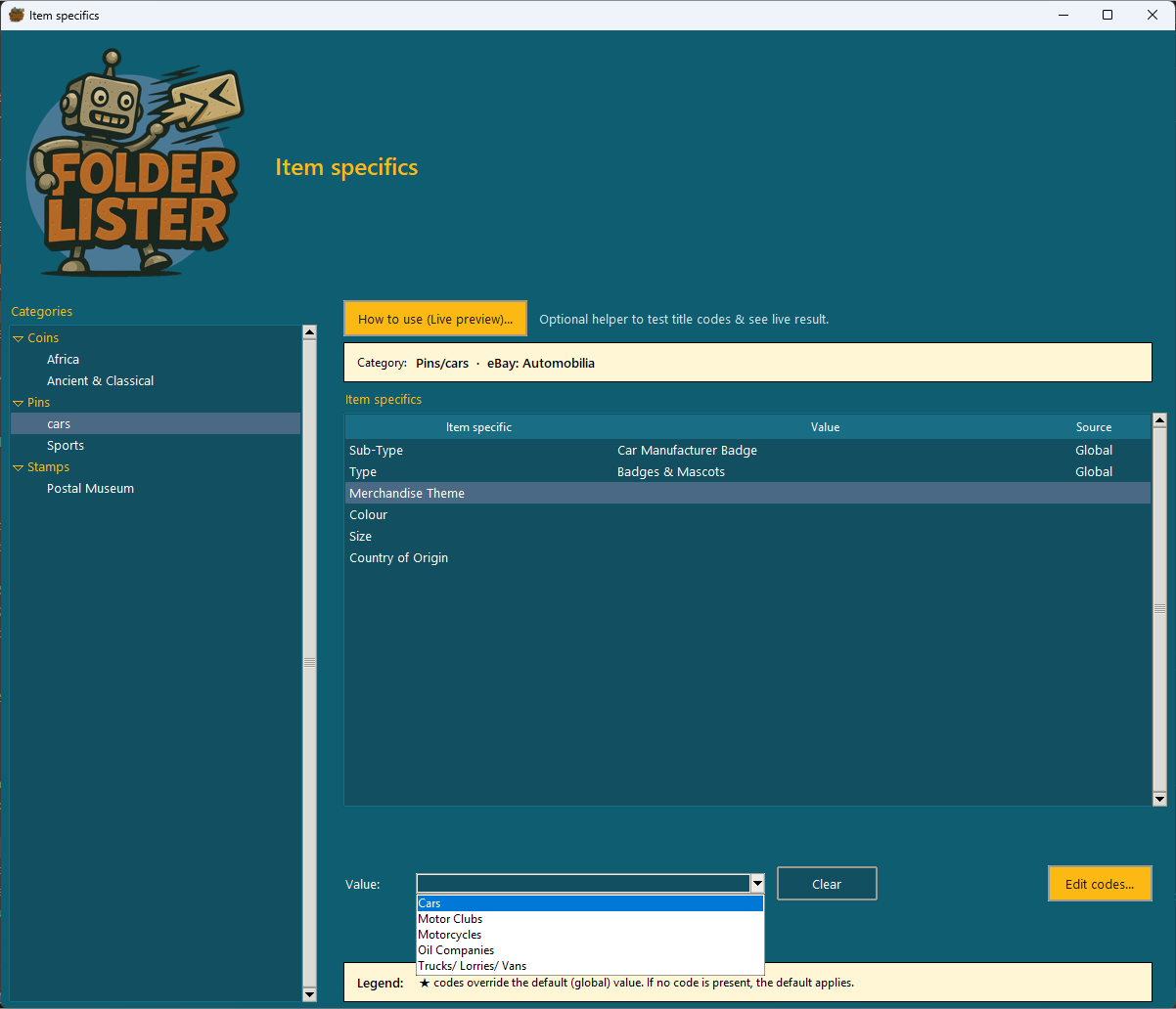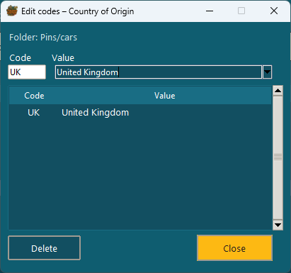 In this example, the code UK is linked to the item specific Country of Origin = United Kingdom. You can add as many codes as you like per folder.