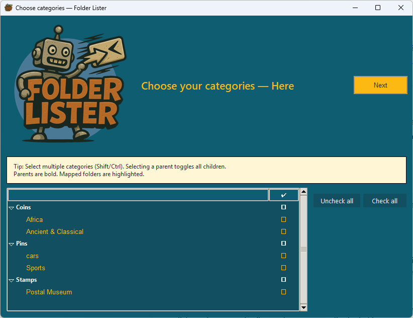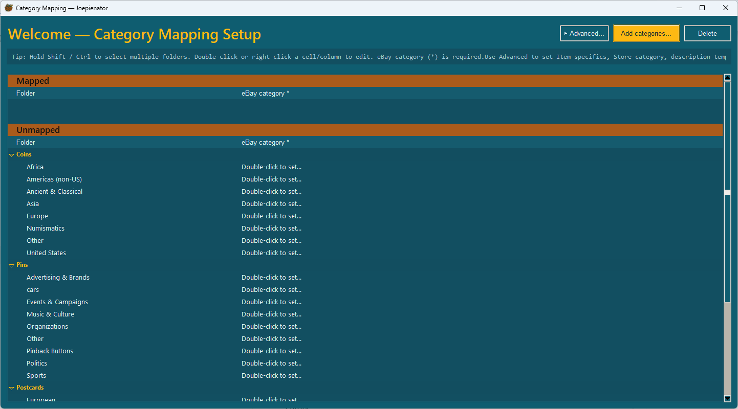 After selecting your folders, the app will open the Category Mapping Setup screen: