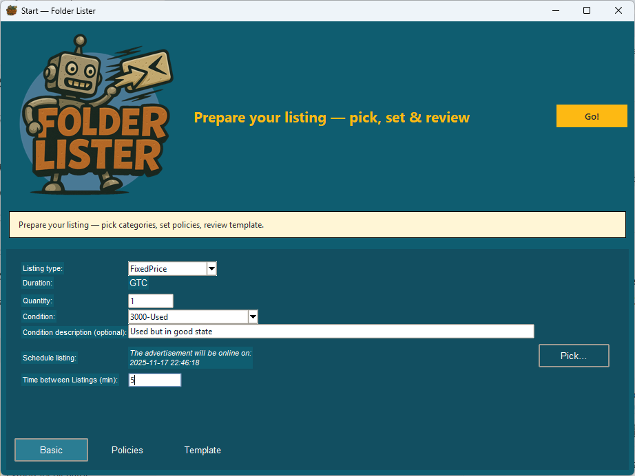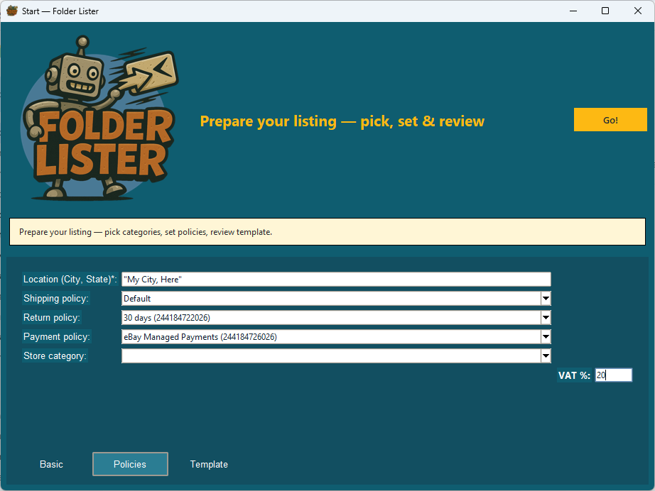 Business policies are loaded automatically from your eBay account and remembered for next runs. Your eBay account must be configured for business policies; see eBay’s own help pages for instructions.