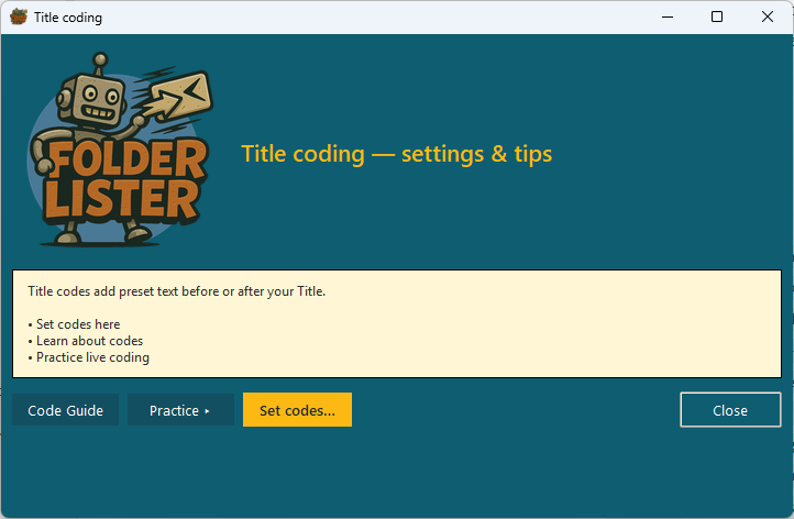 For an overview of all supported codes and advanced tricks, see the upcoming Title codes overview section.