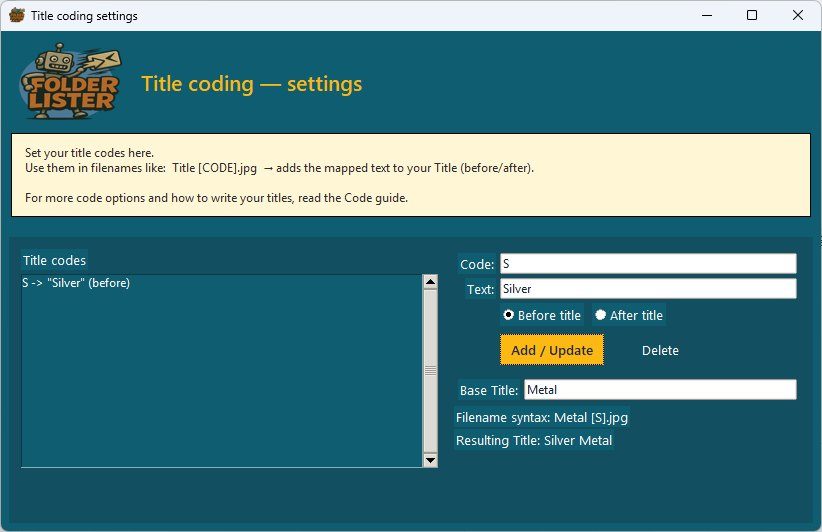 S),Silver),In this example the code [S] adds the word Silver to the title.